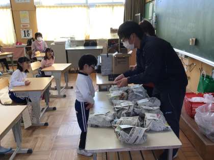 リズムに合わせて、友達の名前を呼んだり、手拍子を打ったりしていました。くじでサツマイモをもらい、子ども達は大喜びでした。