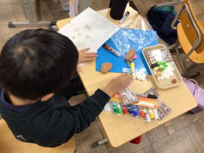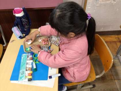 紙粘土でご馳走を作りました。団子やケーキなどいろいろな種類の食べ物ができていました。