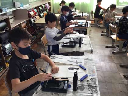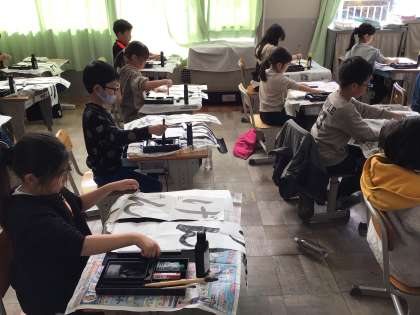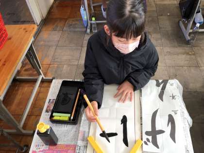 書写ボランティアさんに教えていただいた後、字の位置に気を付けて練習しました。紙がいつもより長いので、まだ扱いに慣れていない様子でした。