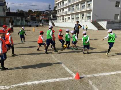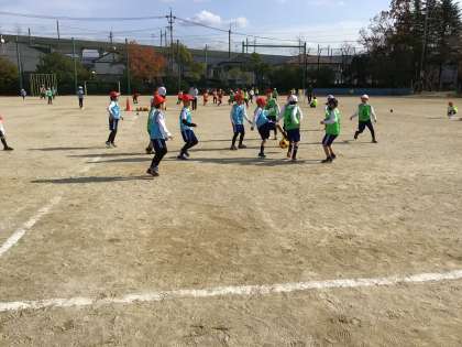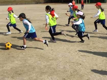 ボールをパスし合うのが難しく、みんなボールに集まっていました。ゴールが決まると大きな声の歓声が上がっていました。