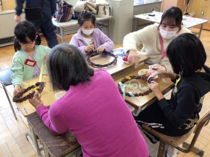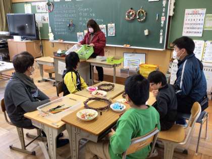ボランティアの方がたくさん来てくださり、ありがとうございました。サツマイモのつるを使い、デコレーションしてリースが完成しました。もうじき、クリスマスです。
