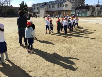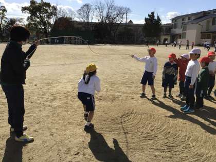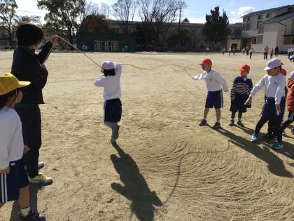 長縄をしていました。縄に入るタイミングが難しいようでした。練習して、少しずつ跳べるようになってきました。