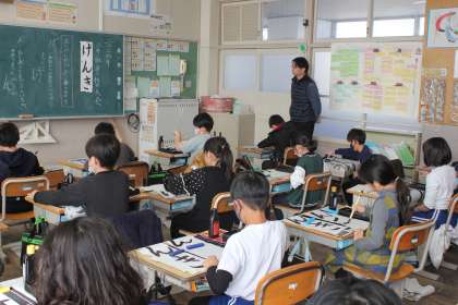 初めて毛筆で書き初め大会をしました。げんき、と書きました。