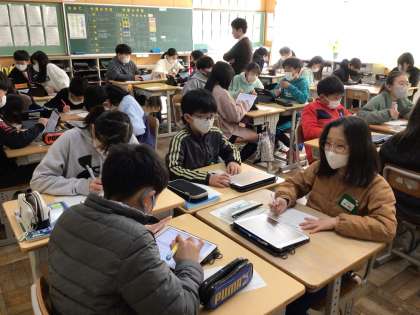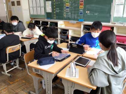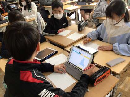 中学の先生が見学に見えました。少し緊張している様子もありましたが、集中して授業に取り組んでいる様子を見ていただきました。算数のデータをどのように集めるか、グループで話し合いました。