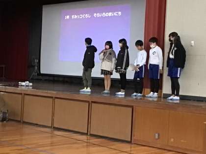 図書委員会から多読賞の紹介やどんな本が人気だったのか発表がありました。運営委員会からは、挨拶をどのようにするといいのか動画を使いながら教えてくれました。全校でよい挨拶ができるようにしたいです。