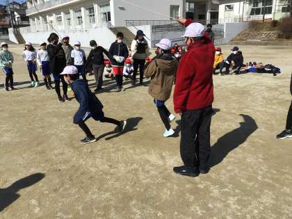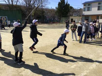 縦割り班での長縄跳び大会が行われました。頑張って、とたくさん掛け声を掛ける姿が見られました。最高記録は、200回でした。