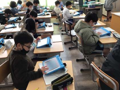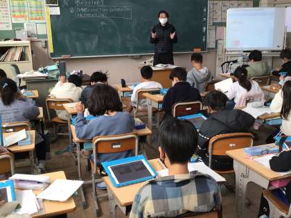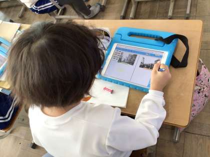今と昔の駅前の写真を比べていました。ペアでグループワークをして、学び合っていました。