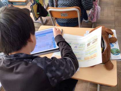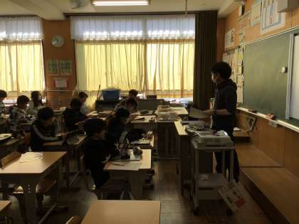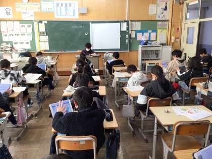 流れる水の働きを学習した後、洪水が起きたらどんなことをすればよいか考えています。調べたことを発表ノートにまとめていました。