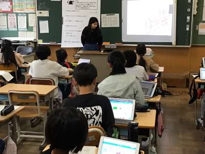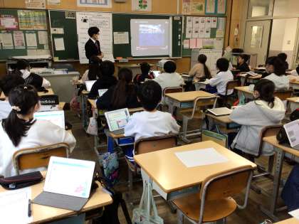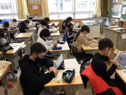 5年生は、流れる水の働きの学習から、梅坪地区で洪水が起こったときにはどうしたらよいか調べてきました。今日は、クラスごとに発表会を行い、友達の発表のよいところを見つけていました。