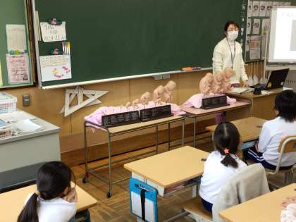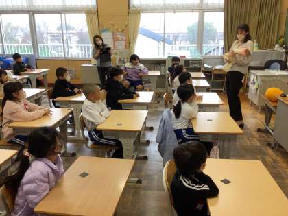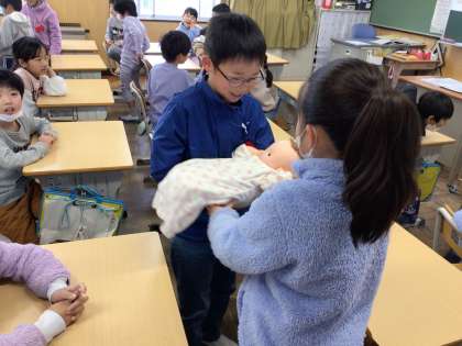 保健師さんが3名みえて、赤ちゃんが産まれるまでの内容を教えてくださいました。胎児の模型に興味津々でした。赤ちゃんの人形も首を固定させて、やさしく抱っこしていました。