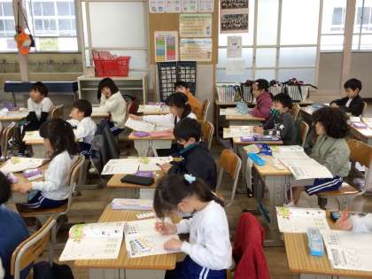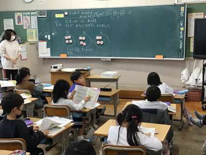 クッキーを同じ数ずつ分ける問題を考えていました。おはじきを使い、実際に分けることで解くことができました。