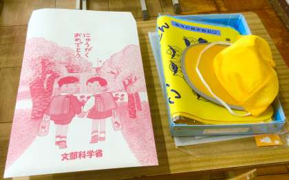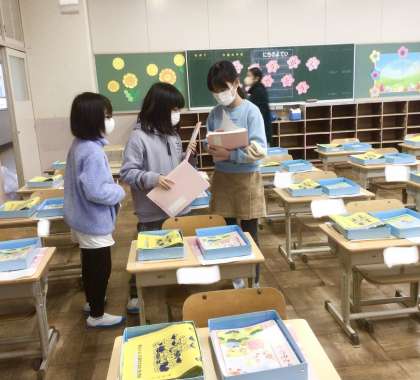 女子の皆さんが、1年生の教室で、配付する物を一つ一つチェックしながら確実に机に置いていきました。