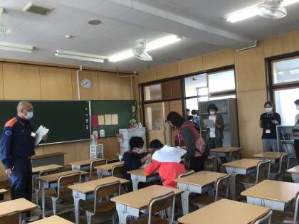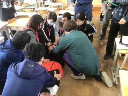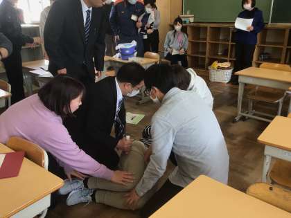 今日は、消防署の方を講師に迎え、本校の職員のシュミレーション研修の様子を見ていただきました。