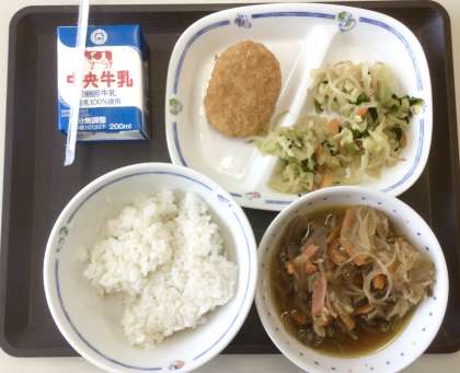 今日のメニューは、ぶた丼、おひたし、コロッケと