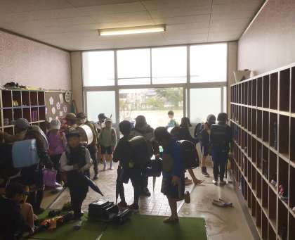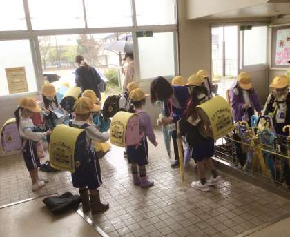 1年生は、教員も手をかしながら、傘や長ぐつなどの処理が自分でできるように促していました。