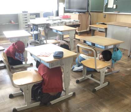 今日は、地震が発生し、おさまったら、その後 家庭科室で火災が起きて運動場に避難するという想定です。