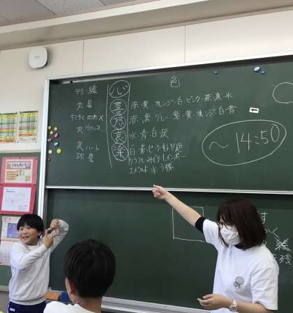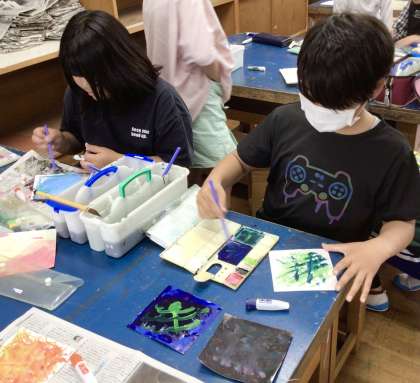 水彩絵の具を使って、小さな画用紙にオリジナルの色を付けていました。