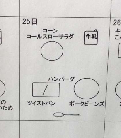 今日の給食は、ツイストパンにポークビーンズの定番メニューです。