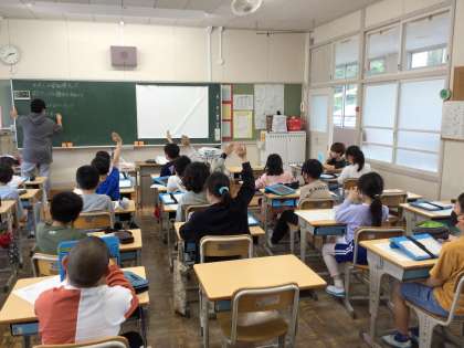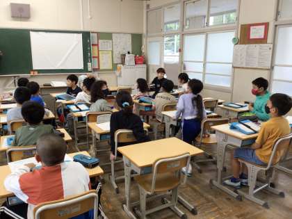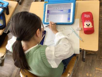 タブレットを使い愛知県には、どんなものがあるか自分のテーマに沿って調べ学習をしていました。調べたことを白地図にたくさん書き込みすることができました。テーマを工夫することの大切さを学びました。