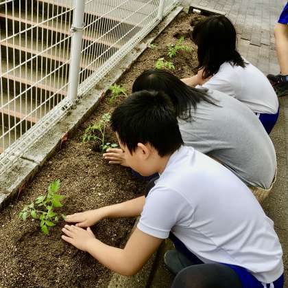 7、8、9、10、11組の子どもたちが、雨が上がった頃を見計らって、夏野菜の苗を植えました。