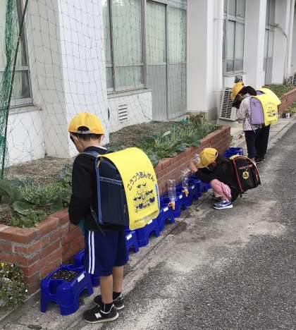 元気に登校したら、アサガオに水やりです!