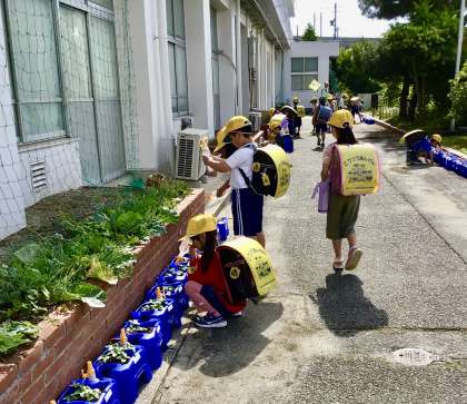 今朝は、朝の時間にミニ通学団会を開き、これまでの登下校を振り返ります。
