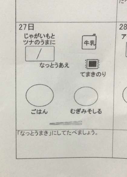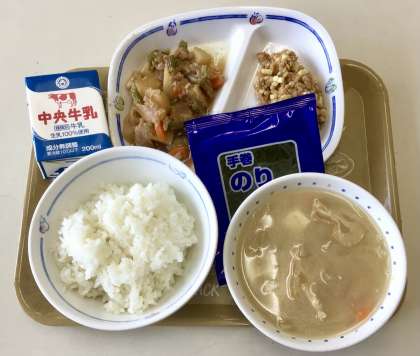 今日の給食は、チーズ納豆に手巻きのり。