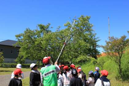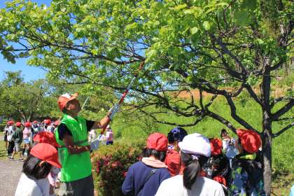 晴天に恵まれ、梅の収穫をしました。地域の方と一緒に作業をしました。なかなか手の届くところに梅がないので、大人に採ってもらったり、棒で叩いて落ちたものを拾ったりしました。ビニール袋に喜んで梅を入れる姿がたくさん見られました。