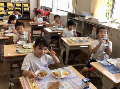 6月11日(火)の梅坪小学校(9)1年生の給食風景