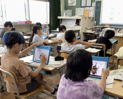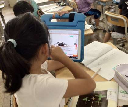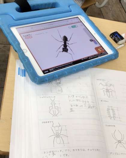 図鑑のアプリからタブレットで昆虫を探して観察していました。