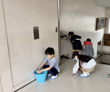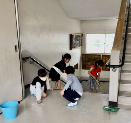 1年生の4人組は、時間を延長して階段清掃を続けていました。