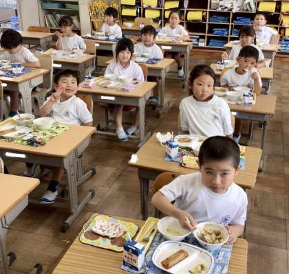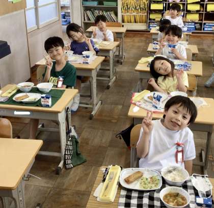6月19日(水)の梅坪小学校(12)1年生の会食の様子