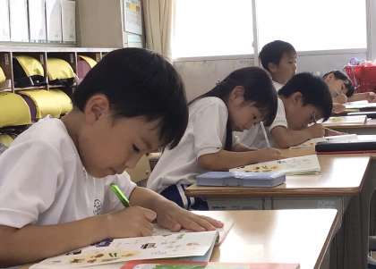 じっくり考えて、教科書に書き込む場面。