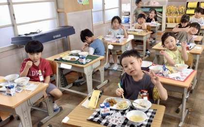6月27日(木)の梅坪小(5)1年生の給食風景