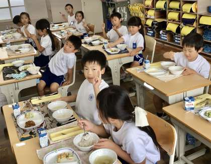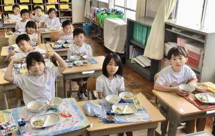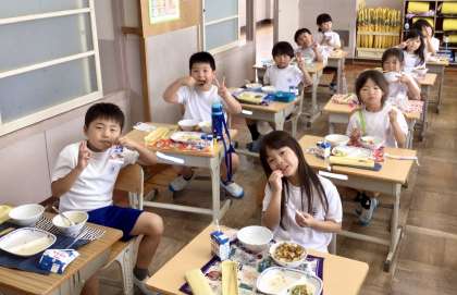 6月27日(木)の梅坪小(7)1年生の給食風景