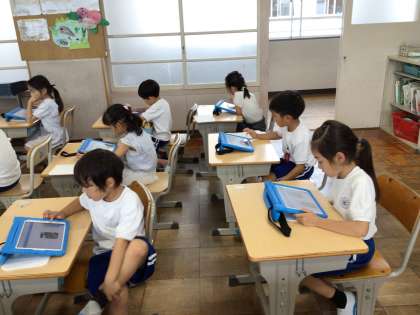 タブレットで朝顔の記録をまとめていました。撮影してきた写真を発表ノートに貼り付ける手順も覚えました。