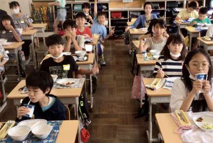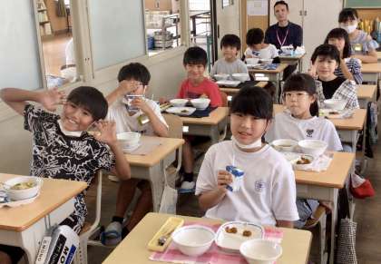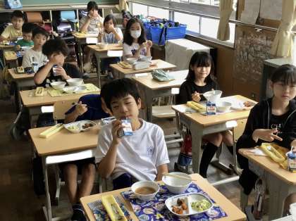 7月3日(水)の梅坪小(10)5年生の会食風景