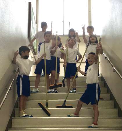 WBGTが高く、外遊びができないとはいえ、そんなことに関係なく階段掃除に集まってくる2年生の皆さん。