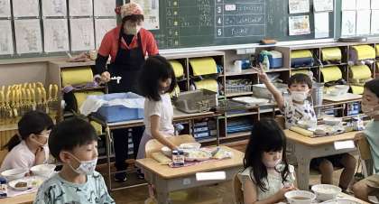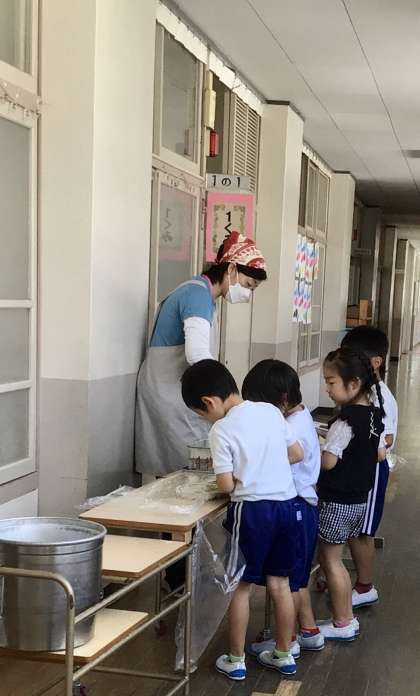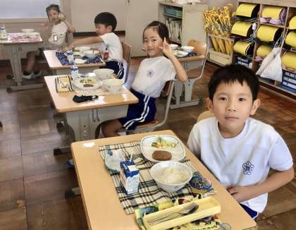 7月5日(金)の梅坪小(8)1年生の会食風景