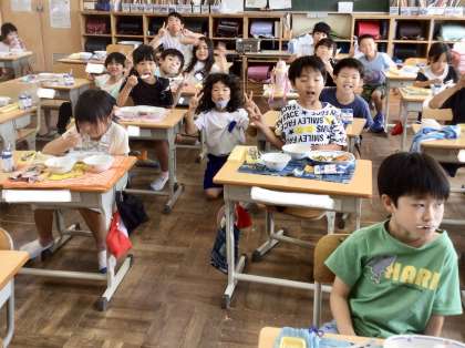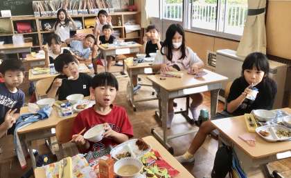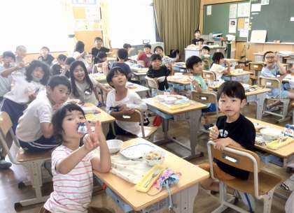 7月8日(月)の梅坪小(6)2年生の会食風景