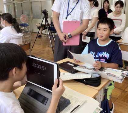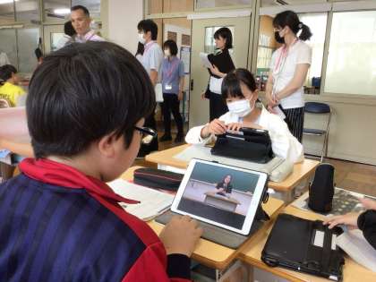 教師が用意し、チームスで配信してあるモデル動画をタブレットで見ながら、話し方や2秒の間の取り方を何度も確認している子もいました。