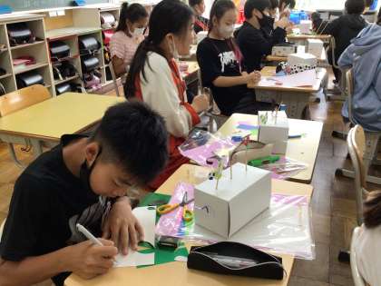 くるくるクランクの飾り付けをしました。棒の長さを変えて、動く様子考えながら、工夫する姿が見られました。