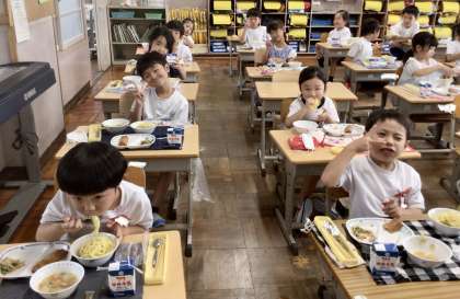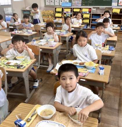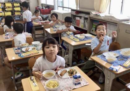 7月16日(火)の梅坪小(13)1年生の会食風景