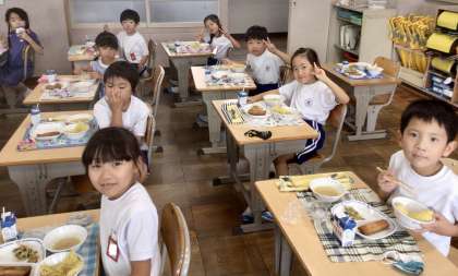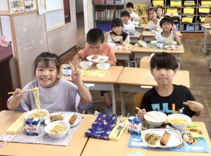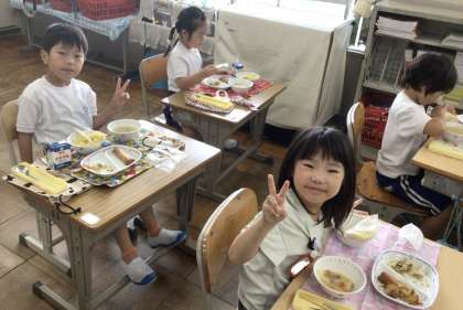 7月16日(火)の梅坪小(14)1年生の会食風景