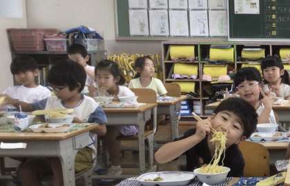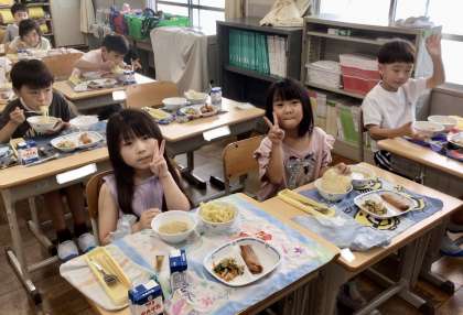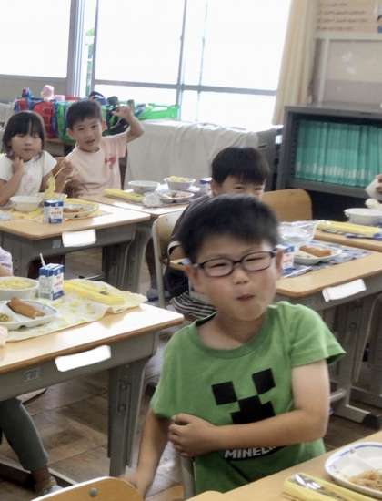 7月16日(火)の梅坪小(15)1年生の会食風景
