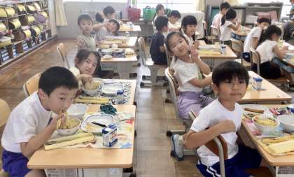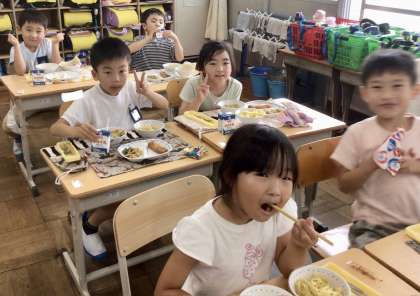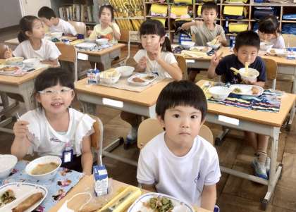 7月16日(火)の梅坪小(16)1年生の会食風景