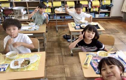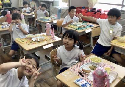 7月16日(火)の梅坪小(18)1年生の会食風景