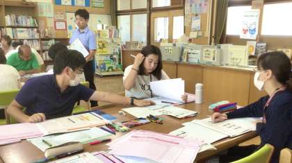 今日は、教務主任、現教主任のリードのもと、各担任が自分のクラスのよさや足りなさを分析して、9月からの学級経営にどう活かしていこうか考えながら取り組んでいました。
