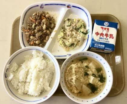 本日は、大豆のピリから炒めに、かき玉汁ほか。