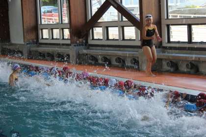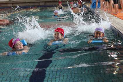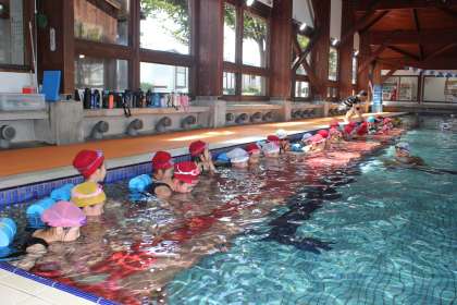 今日からスイミングスクールのプールで水泳の授業が始まりました。